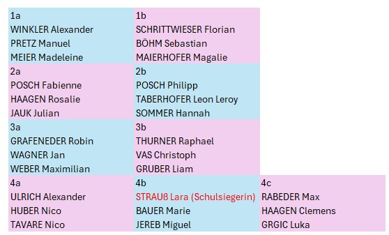 Im Anschluss an den Wettbewerb fand eine Siegerehrung statt. Dabei wurden die besten TeilnehmerInnen unserer Schule besonders geehrt und mit kleinen Preisen ausgezeichnet. Die Veranstaltung würdigte nicht nur ihre herausragenden Leistungen, sondern motivierte auch alle anderen, im nächsten Jahr erneut teilzunehmen!